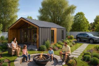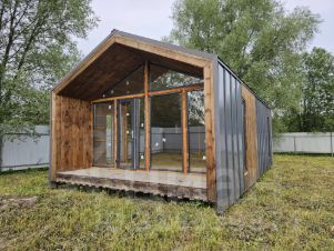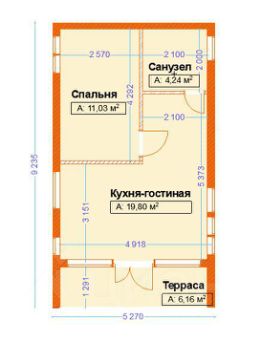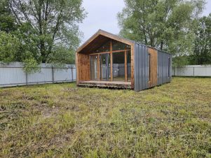 Планировка дома подразумевает просторную кухню-гостиную площадью 19,8м2 с панорамными окнами, спальню 5,6 м2, санузел и открытую веранду, где приятно выпить кофе под пенье птиц.