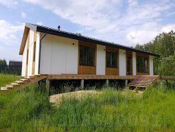 Каркас дома выполнен из строганной доски камерной сушки, обработан огнебиозащитой. Стропильная система на мзп, заводского изготовления, гарантия производителя 25 лет. Фундамент забивные жби сваи.