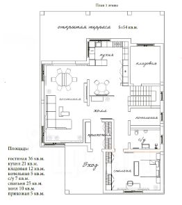 На первом этаже расположены: Просторная гостиная 36 кв.м., Кухня 21 кв.м., Спальня 25 кв.м., Кладовая 12 кв.м., Котельная 5 кв.м., с/у 7 кв.м., Холл 10 кв.м., Прихожая 5 кв.м.
