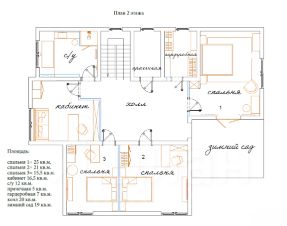 На втором этаже расположены три спальни 21/15,5 /25 кв.м. с выходом в зимний сад 19 кв.м., Кабинет - 16,5 кв.м., с/у 12 кв.м., Прачечная 5 кв.м., Гардеробная 7 кв.м., Холл 20 кв.м.