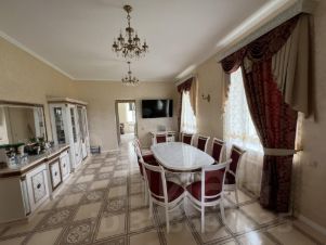 В доме 2 оборудованные кухни, столовая на 8 персон, каминный зал (камин отделан мрамором) со вторым светом, 2 лестничных марша, бильярдная (русский стол), помещение под кинотеатр (без отделки), помещение бассейна (без отделки, чаша из бетона залита), помещение спортзала, зона сауны (Финская) с душем, туалетом, зимним садом, помещением для отдыха, несколько кабинетов, несколько гардеробных помещений и для хранения, 7 спальных комнат, 7 туалетных комнат, постирочная, полноценный мансардный этаж с окнами без отделки, коммуникации заведены (отопление, ХВС, ГВС, электричество, интернет), веранда с мангалом и столом на 6 персон. Парадное крыльцо в дом отделано гранитом, ступени, балясины, перила, опорные столбы.