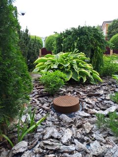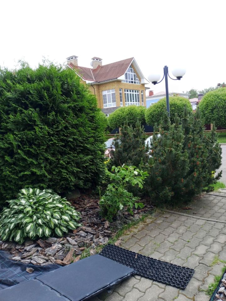 Участок земли 3 сотки, с ландшафтным дизайном, где посажено множество декоративных растений и зоной барбекю.