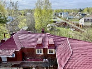 Двухэтажный особняк из карельской березы с декоративной кирпичной отделкой.