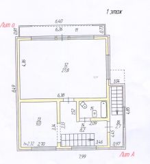 -1й этаж: коридор, совмещенный санузел, кухня, большая комната 27 кв.м, балкон с видом на участок.