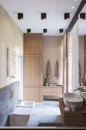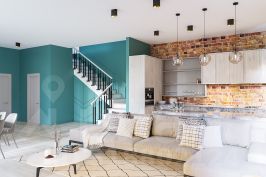 На 1-м этаже расположены прихожая, котельная, кухня-гостиная с камином, санузел, спальня, гараж. На 2-м этаже расположены 2 спальни, гардеробная, санузел, холл, 3 террасы. С террасы по внешней лестнице выход на эксплуатируемую кровлю с каминной зоной. Высота потолков 3,1 м.. К дому проложены инженерные коммуникации: газ, вода, электричество, канализация, интернет, видеонаблюдение. В поселке работает эксплуатационная служба, которая в режиме быстрого реагирования решает возникающие хозяйственные вопросы. Забор по периметру, круглосуточная охрана. Посёлок находится в окружении леса, полностью благоустроен. Река Истра в 10 мин ходьбы. Поблизости от поселка расположены муниципальная школа и детский сад. Напротив усадьба графа Кутайсова. Сегодня это пансионат Управделами президента РФ и дом отдыха Снегири. На территории дома отдыха фитнес-центр, рестораны, комплекс бань, большая прогулочная зона. Недалеко находится Novaya Riga Outlet Village и вся инфраструктура новой риги.