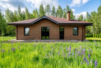 Построен из кирпича 380 см., утепление 50 мм., снаружи отделан облицовочным кирпичом. Фундамент ленточный, глубиной 2,2 м. Мягкая черепица, утепление 200 мм.