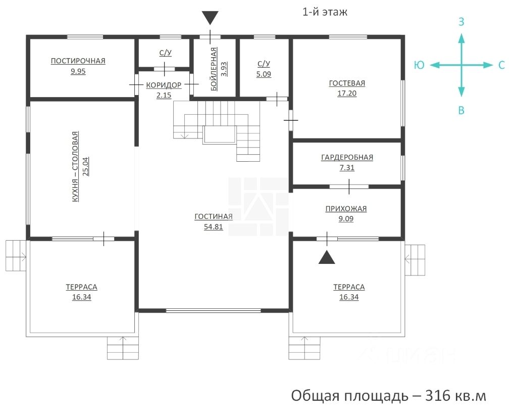На первом этаже расположены: входная группа с гардеробной; кухня-столовая, гостиная с камином ручной работы и топкой Contura (Швеция); гостевая спальня, санузел, гостевой санузел, прачечная и котельная (оборудована из нержавеющей трубы Valtec, насосными группами Grundfos), а также дублирующим электрическим котлом Kospel и газовым котлом Viessmann. Водоснабжение и отопление выполнены из металлополимерной трубы Rehau Rautitan Stabil. Полы отделаны итальянским полированным мрамором, а также штучным дубовым паркетом высочайшего качества. Теплые полыRehau RAUTHERM, скрытые радиаторы Stout и настенные Arbonia и Kermi. Электрощит собран с использованием оборудования ABB, а вытяжная система - Vilpo. Межэтажная лестница выполнена в Италии, с несущим стальным каркасом толщиной 10 мм, а ступени и перила изготовлены из массива ясеня.