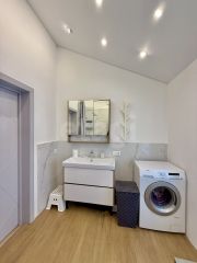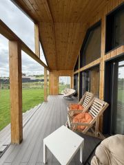 Планировка включает три спальни, гостиную, совмещенную с кухней, санузел, техническое помещение и открытую веранду 25 кв. м. Отопление организовано через теплый пол в гостиной, кухне, санузле и коридорах, в спальнях установлены конвекторы. Коммуникации автономные: артезианская скважина, септик, электричество 15 кВт, по границе участка проходит газовая труба для возможного подключения.