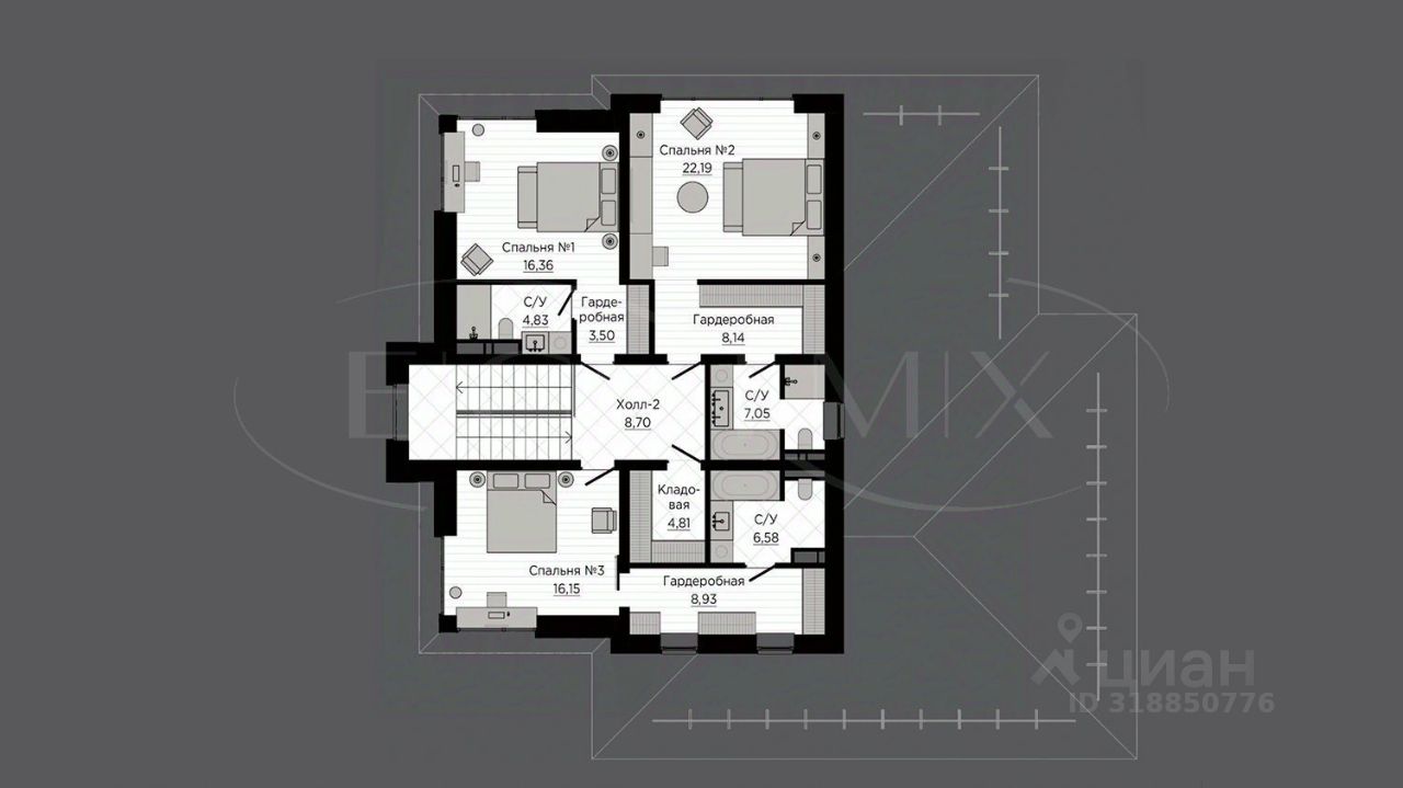 2 этаж - 3 спальни с гардеробными и совмещенными с/у.