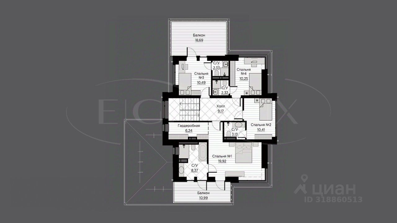 2 этаж - 4 спальни с гардеробными и совмещенными с/у, 2 балкона.
