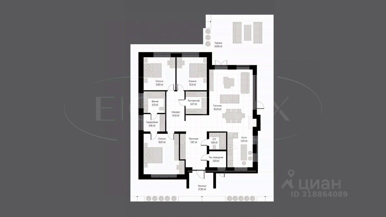 кухню, гостиную, просторную террасу, 2 спальни, 1 спальня с гардеробной и с/у.