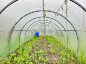 Участок огорожен забором, на участке есть небольшой домик с хозблоком, душ и новая теплица.