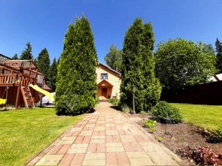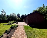 Участок перед домом (солнечная сторона): газон (под газоном уложена сетка от кротов), детская площадка с песочницей, горкой и качелями, площадка с летнее джакузи, площадка для стоянки гостевого автомобиля; дорожка и площадки выложены тротуарной плиткой, несколько кустов смородины, грядка с клубникой, туи, альпийская горка, цветник. Гараж с рольставнями под один большой автомобиль со стеллажами и местом для садовой техники.