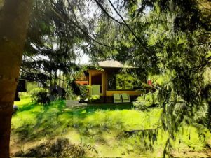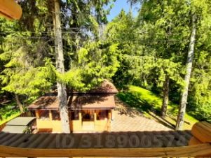 Баня 48 м2 из клееного бруса: веранда, комната отдыха (диван, деревянные стол и стулья, телевизор, холодильник, стеллаж), большая парилка, мощная дровяная печь с лёгким паром (с камнем жадеит) отделана талькохлоритом, купель, санузел с душевой кабиной. Растопка печи из коридора. Огромное на всю стену окно с видом на лес.