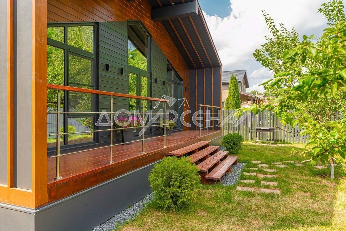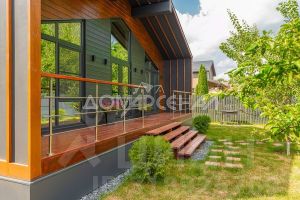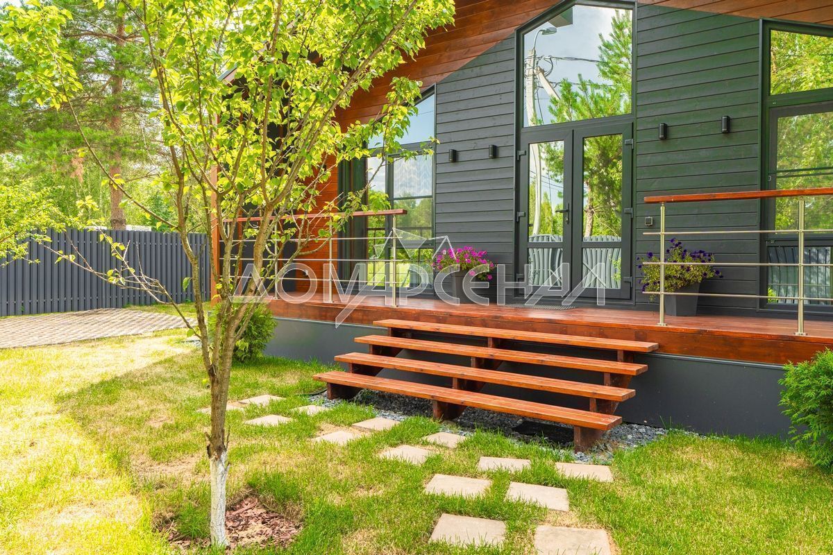 На участке выполнен ландшафтный дизайн, растут крупные деревья и кустарники.