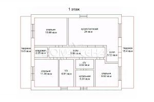 Прихожая, кухня-гостиная с выходом на террасу, 2 спальни с выходом на террасу, спальня/кабинет, ванная комната, кладовая/гардеробная, с/у с душевой, котельная.