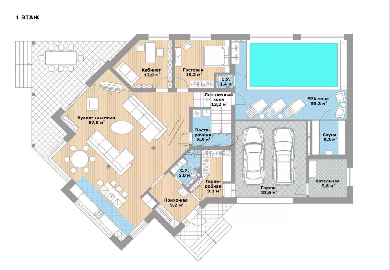 Общие помещения: терраса, прихожая (9,2) с гардеробной (9,1) и гостевым с/у (5), объединенная кухня-столовая-гостиная (87) и выходом на террасу с видом на лес, кабинет (14), спа-зона с бассейном (53,3), сауна (8,3), душевые и с/у (1,4), гараж на 2 м/м (33,6), лестничный холл (13,2), постирочная (8,8), котельная (9,6). Спальни: гостевая спальня (15,2).