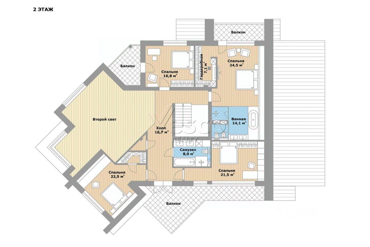 Спальни: мастер-спальня (24,5) с гардеробной (7,1) и ванной комнатой (14,1). Три детские (21,5 + 16,8 + 22,5) с общей ванной (8).