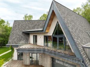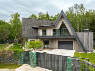 Современный коттедж, выполненный по стандартам экологического и энергоэффективного строительства. Вентилируемый фасад, отделка из термолиственницы (планкен), сохраняет комфортную температуру круглый год, снижая затраты на отопление и кондиционирование.
