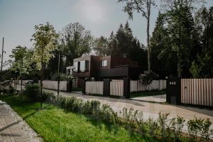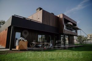 - Фасад: термоясень. Встроенные в фасад водоотводы. Архитектурная подсветка.