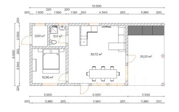 Планировка: Кухня-гостиная 30,72 м2 , 1 изолированная комната 10.96 м2, совмещенный санузел 3,12 м2 , техническое помещение, в котором находится инженерная система дома 3,0 м2, терраса 20.20 м2.