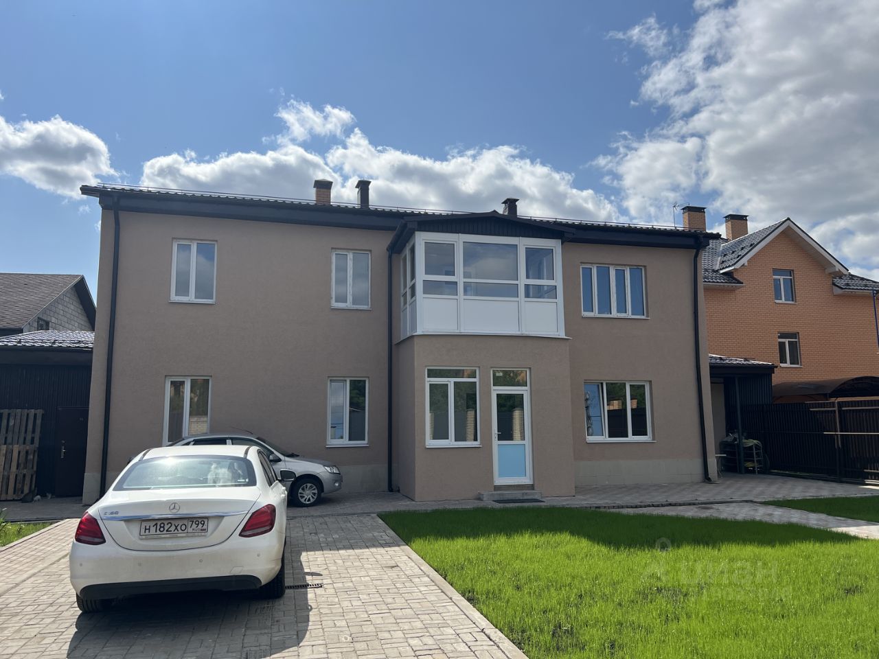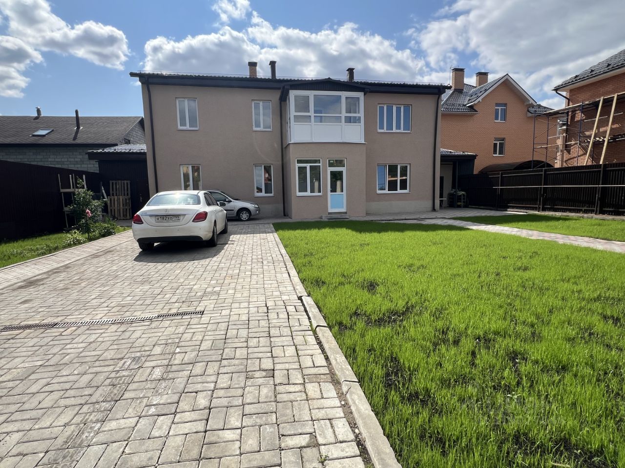 Ухоженный участок с газоном и площадкой для трех авто. Сделан дренаж по периметру участка. Кирпичный забор с автоматическими воротами.