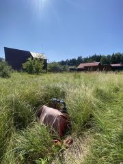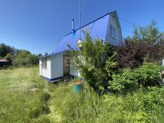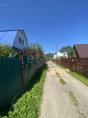 Участок площадью 5 соток ухожен и выровнен, на нем растет зеленый газон. С дороги его ограждает надежный забор из профлиста, установлены распашные ворота для удобного доступа. На территории также находятся хозяйственный блок, летний душ, туалет и теплица, что делает дачу идеальным местом для отдыха и ведения садоводства.