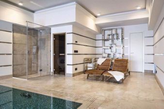Спа-зона с выходом на террасу: настоящий оазис релаксации с бассейном, противотоком, сауной и зоной отдыха.