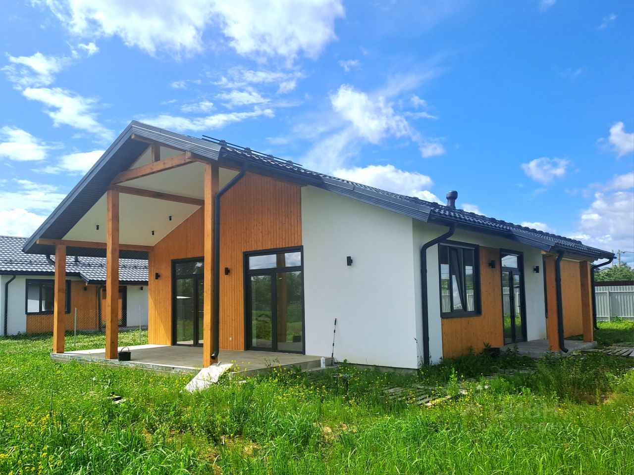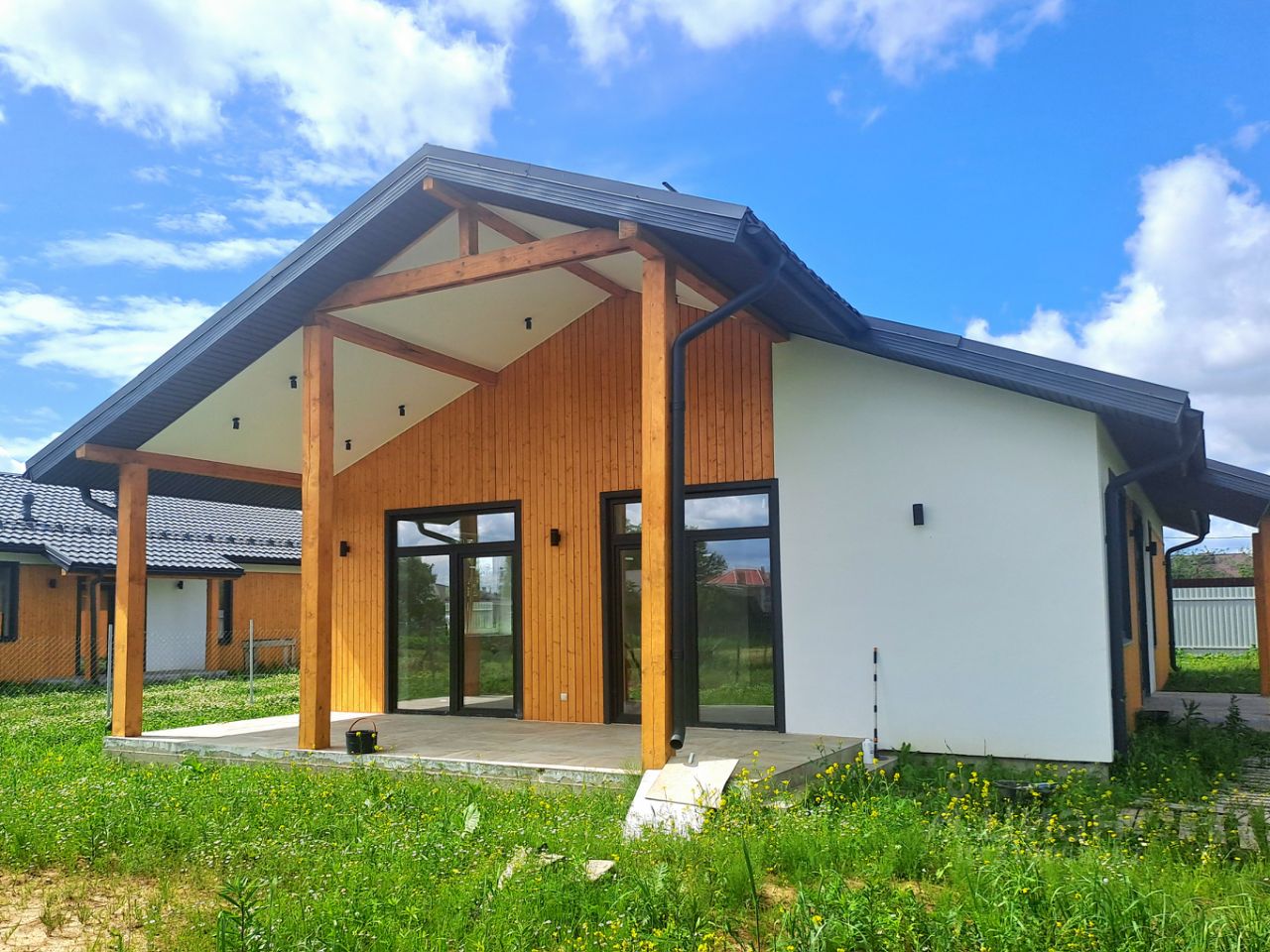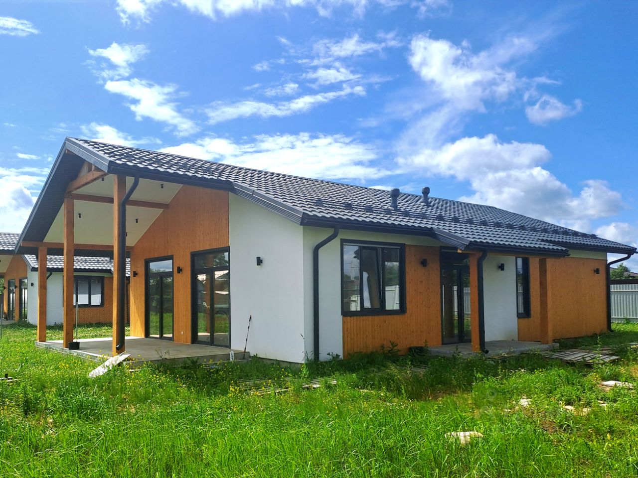 Кухня-гостиная площадью 40 кв.м. с панорамным остеклением и выходом на террасу, 3 спальни, 2 санузла, отдельное техническое помещение.