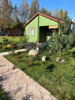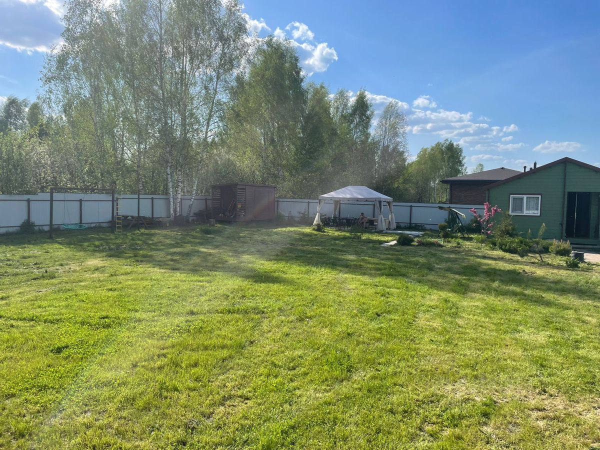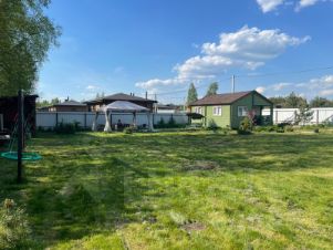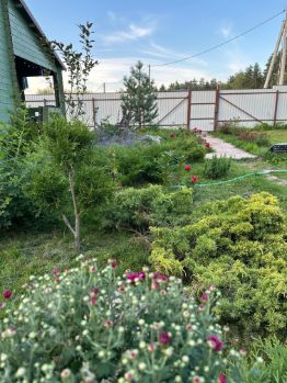 На участке установлен шатер-беседка 4*6 с садовой мебелью и мангальной зоной, садовые качели, детская площадка с качелями и лесенкой, турник. Так же техпостойка 6*3 (сарай, дровница, уличный туалет). Забор из профлиста, распашные ворота, калитка. Колодец. Озеленение туи, хвойники, кедры, так же яблони, груша, смородина и пр. Расположение строений на участке предполагают строительство зимнего дома (сейчас большой газон)