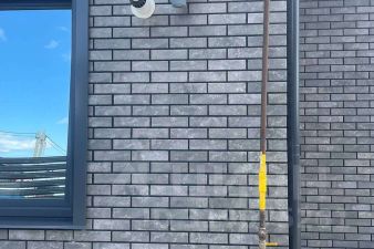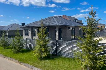 Дом из газосиликатного блока Bonolit, снаружи отделан термопанелями с клинкером Парадис, кровля металлочерепица производства Grandline, установлены пластиковые окна Rehau, установлено внешнее освещение дома.