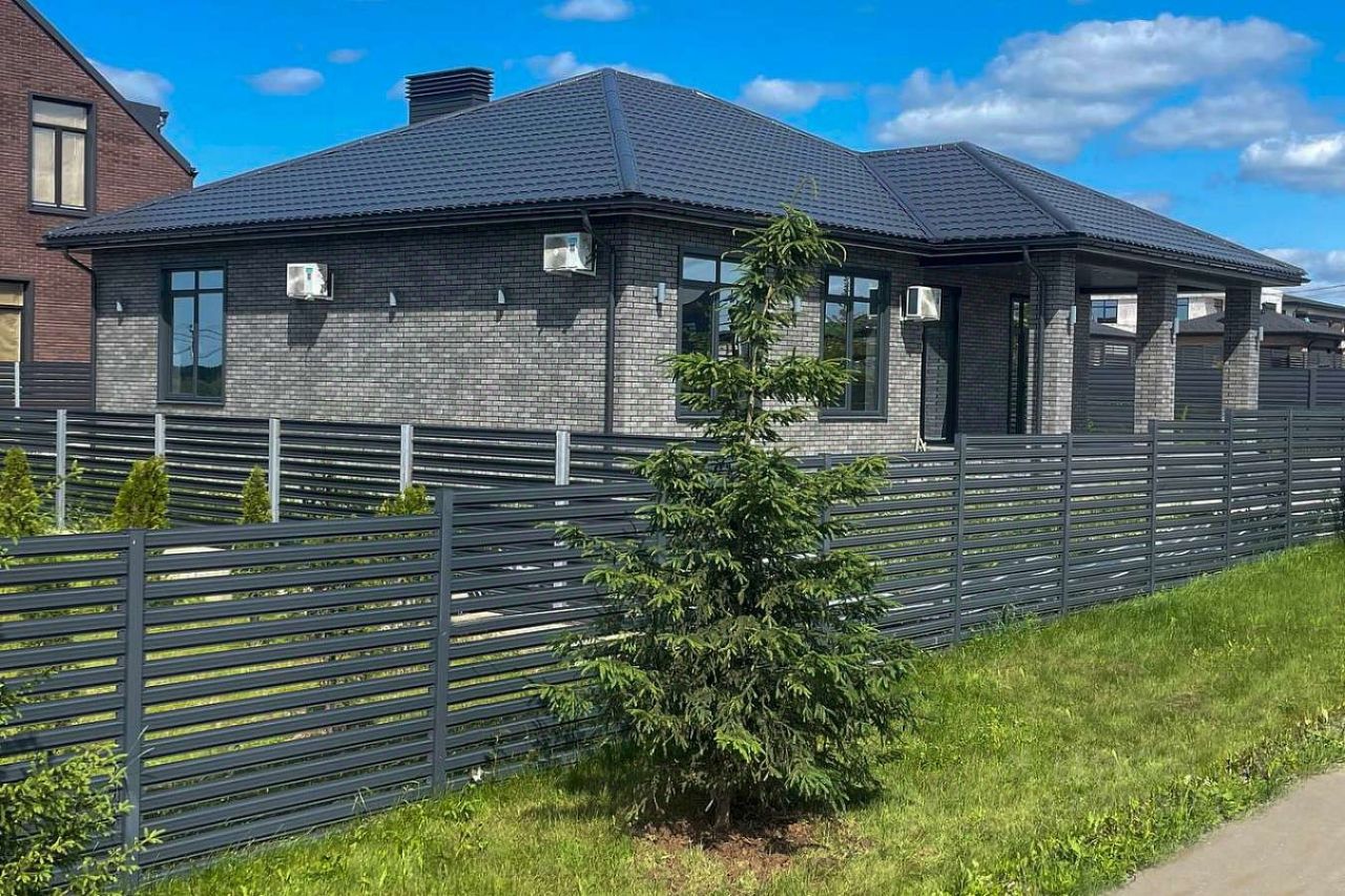 Участок огорожен забором из металлического евроштакетника высотой 2 м., в единой стилистике коттеджного посёлка, выполнена парковка на 2 автомобиля, входная группа с распашными воротами и калиткой.