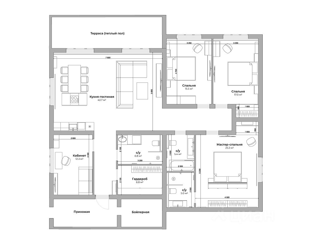 Коттедж подойдет для постоянного проживания большой семьи: 4 спальни, 3 санузла, кухня-гостиная с выходом на большую крытую террасу.