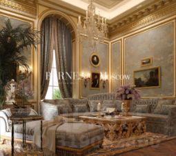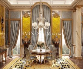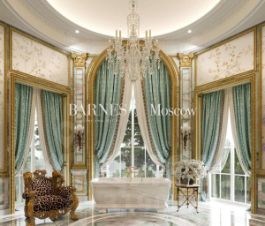 • Первый этаж: 2 545 м² — парадная зона, гостиная, столовая, кухня, гардеробные, детские спальни и ванны, терраса, холлы, мини-кухня.