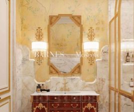 • Цоколь: 2 885,2 м² — тех. помещения, гараж, спортзал, комнаты отдыха, кухня, хамам, сауна, бассейн, кладовые, лифтовая шахта, винный погреб и бар, сейфовая, раздевалки.