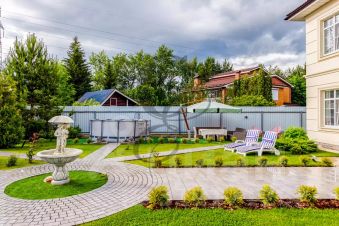 Зона барбекю с верандой, фонтан, декоративные туи, ели, сосны, плодовые деревья и розы