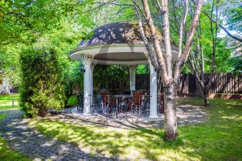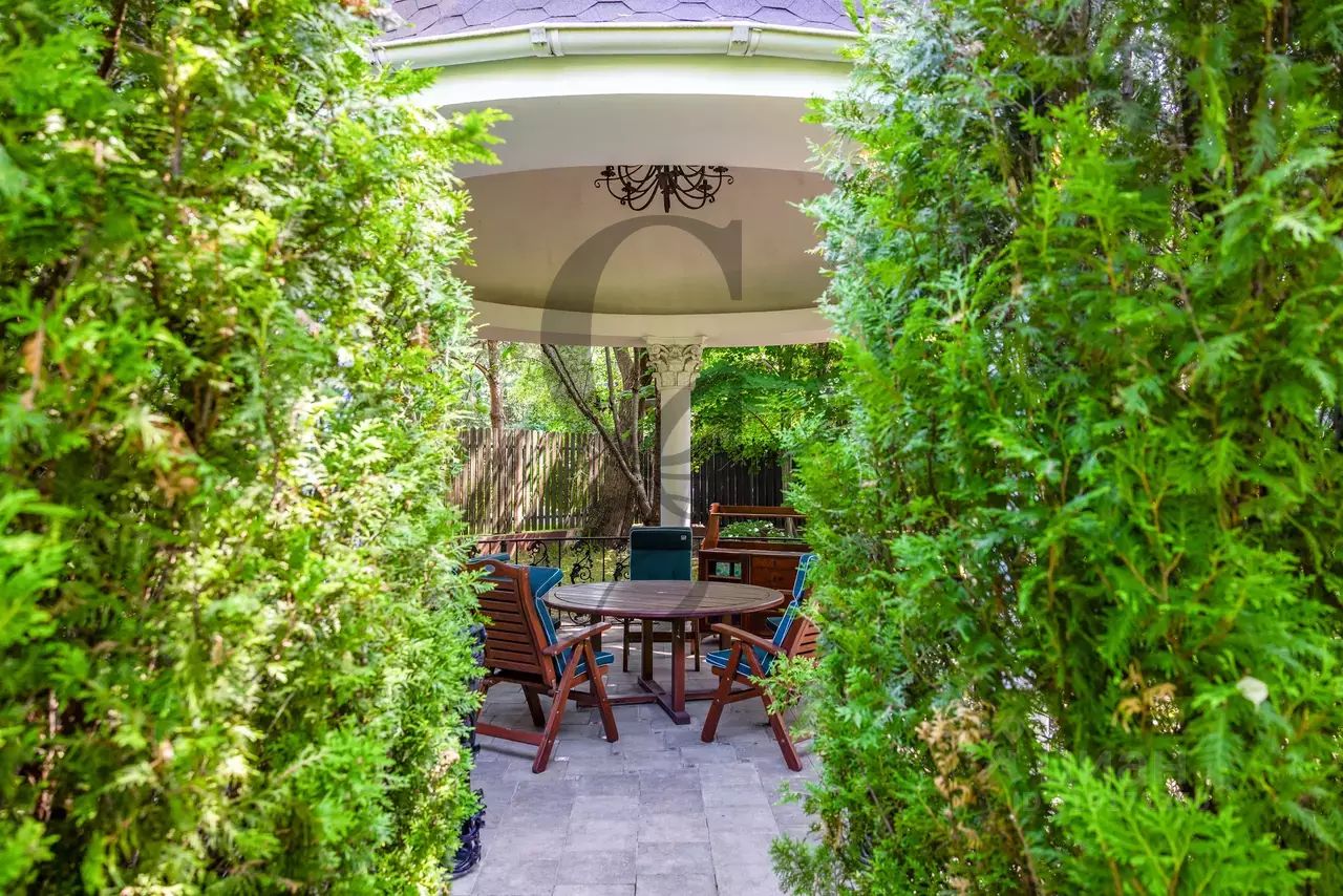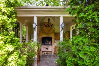 На территории также имеются дополнительные постройки, такие как открытый теннисный корт, фонтан, пруд, зона для барбекю и летняя ротонда. Этот участок с ландшафтным дизайном предлагает комфорт в каждой детали.