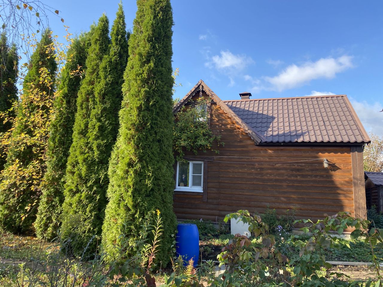 По насаждениям: много хвойников, яблони, груша, вишня, черноплодная рябина, смородина, малина.