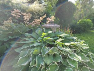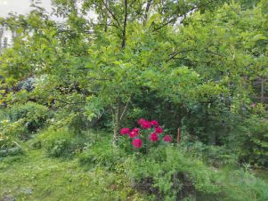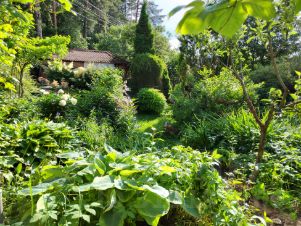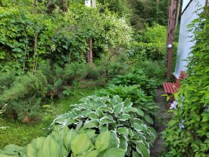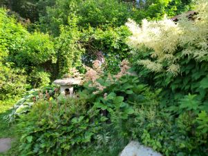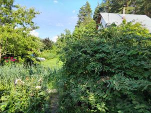 Много плодово-ягодных деревьев (голубика, ежевика, йошта, ирга, смородина, виноград...), так же есть несколько высоких грядок. Каменные композиции, искусственные водоемы выглядят, как ландшафтное украшение сада.