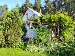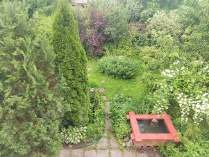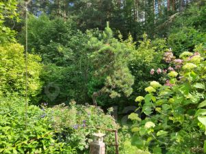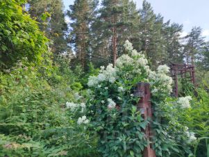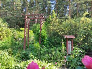 Участок расположен в непосредственной близости с сосновым лесом, забор на участке исполнен живой изгородью.