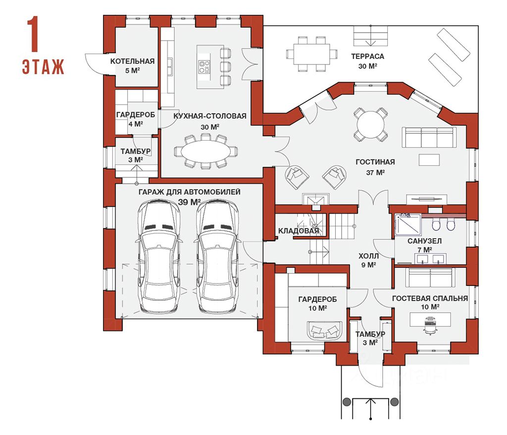 1 этаж: холл, гардеробная, с/у, кабинет, постирочная, кухня-столовая, гостиная, гараж на 2 машиноместа, котельная, кладовая.