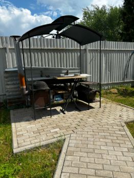 Дорожки из брусчатки и сарай. Мангальная зона. Открытая сторона забора с видом на лес (крайний участок). Обустроенное машиноместо на два авто выложено брусчаткой.