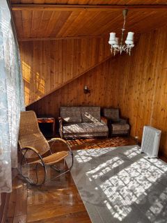 ДОМ 75 м2, деревянный 2-х этажный: первый этаж-гостиная с камином, кухня с печью, спальня и холл; второй этаж мансардный-2 просторные спальни. Дополнительное строение хозблок , в нем душевая кабина с эл.водонагревателелем, бытовое помещение и дополнительная гостевая комната.