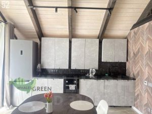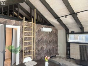 В доме холл при входе с лапомойкой, сан узел, спальня с выходом на террасу, кухня-гостиная с выходом на террасу и лофт с возможностью оборудовать там спальное место.
