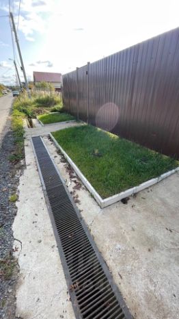 Сделан бетонный въезд на участок с двумя клумбами, кюветом, закрытым решетками, закладная основа для откатных ворот