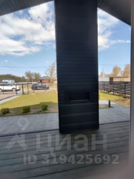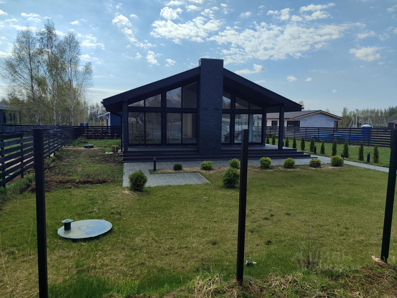 По периметру дома высажены туи, высажен газон. Есть отсыпанная площадка на два автомобиля.
