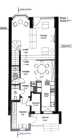 1 этаж: "Сердце" дома кухня-гостиная 30 м²+ кухня-столовая 22 м² с выходом на террасу и свой зеленый дворик для семьи, друзей, гостей без тесноты! Также на этаже просторная прихожая, гостевой санузел, прачечная, бойлерная.