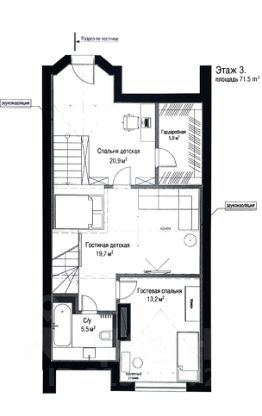 3 этаж: зонированная спальня с гардеробной, вторая спальня, гостиная и санузел.