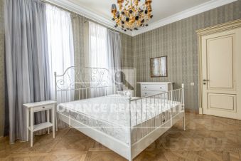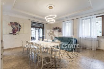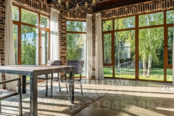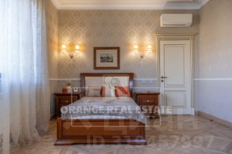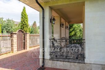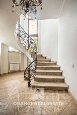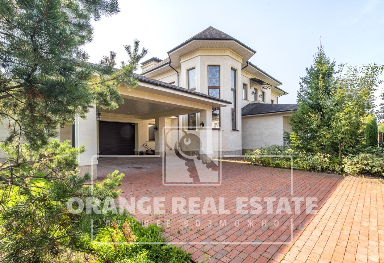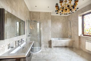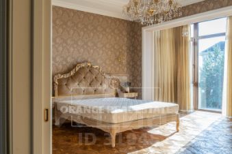 На стенах эксклюзивные шелковые обои, венецианская штукатурка, пол - мрамор и наборный паркет. Панорамное остекление, витражи. По периметру дома - видеонаблюдение. На участке высажены взрослые деревья, имеется навес для автомобиля.