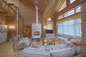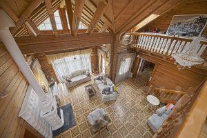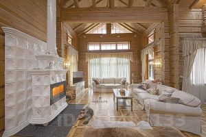 Гостиная 52 кв.м. с камином и вторым светом. Высота потолков 6 метров.